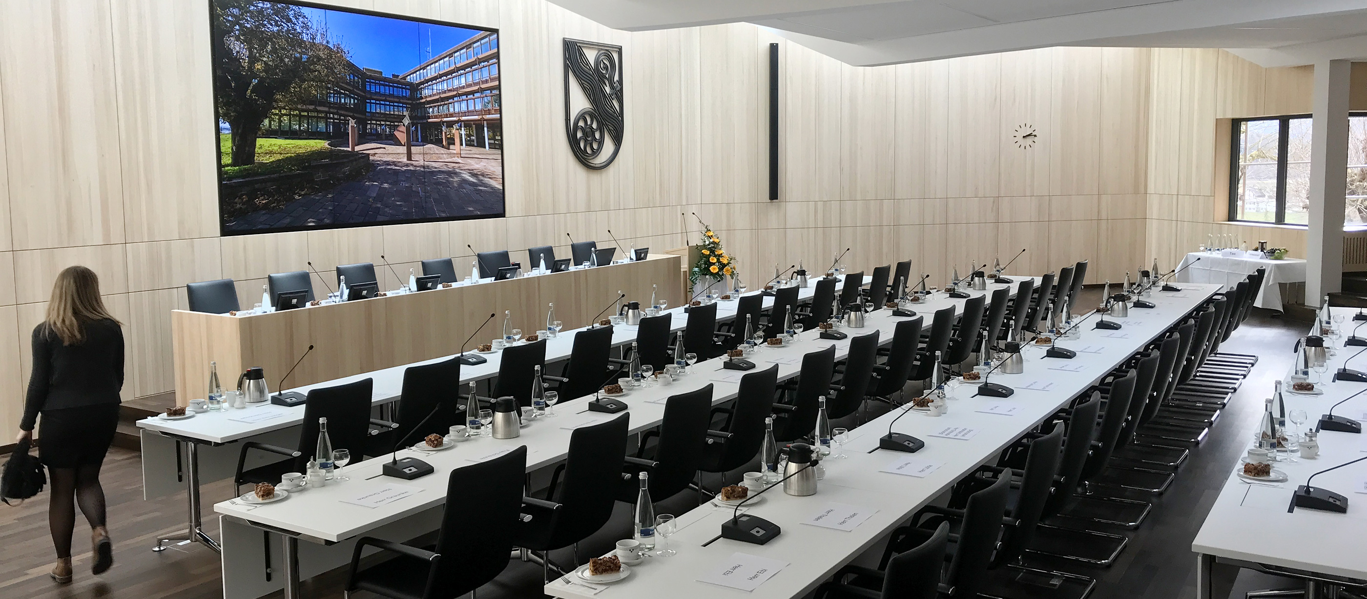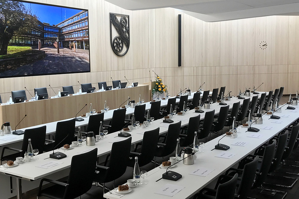 Für den Ratssaal im Rathaus Singen a.H. haben wir eine digitale Linearrays von Bose installiert, sowie ein Crestron Touchpanel mit Steuerung. Eine drahtlose Bildübertragung, inkl. Bildvorschau am Touchpanel.
